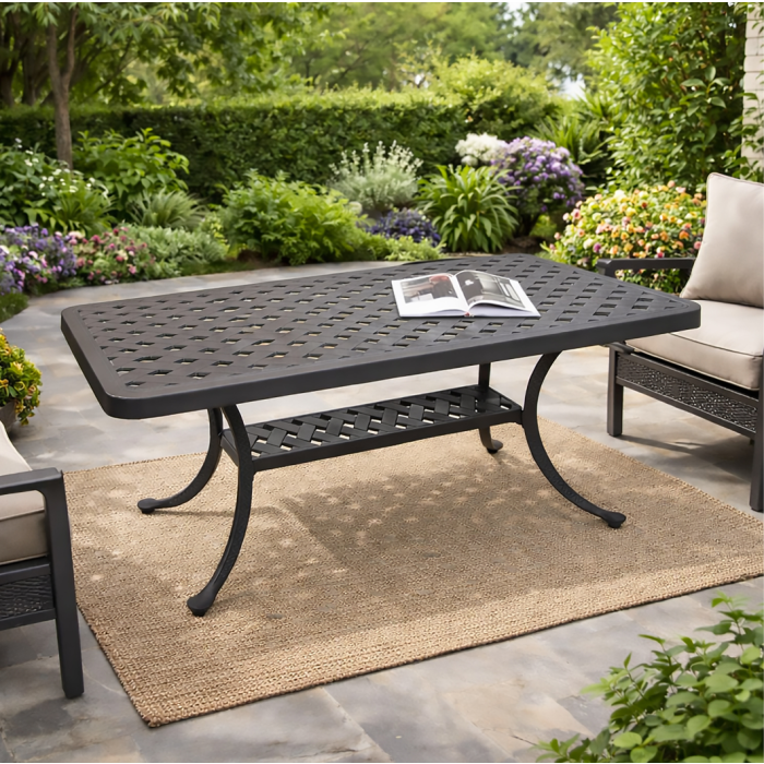 Tavolino ROSIE con struttura in alluminio pressofuso colore antracite, dimensioni 107×54 h.47 cm; il prodotto viene fornito smontato, ideale per ambienti moderni grazie a design compatto, leggerezza e resistenza dei materiali, facile da assemblare e adatto a interni e spazi esterni protetti.