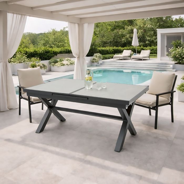 Tavolo da esterno estensibile con struttura in alluminio color antracite e top in pietra sinterizzata colore grigio perla, progettato per coniugare eleganza e durabilità negli spazi outdoor; misura 220×110 cm con altezza 76 cm da chiuso ed è estensibile fino a 320×110 cm, offrendo ampia superficie d’appoggio, e viene fornito smontato, pronto per un montaggio semplice e rapido.