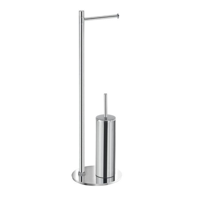 Piantana porta rotolo e portascopino linea MIDA realizzata in acciaio inox e Cromall, colore cromato, dimensioni 24×15,5 h. 69,7cm, design compatto e stabile che unisce funzionalità e resistenza alla corrosione; prodotto fornito smontato, facile da assemblare e perfetto per ottimizzare lo spazio del bagno con un tocco contemporaneo ed elegante.