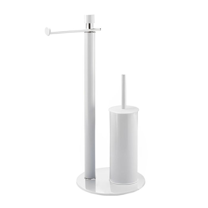 Piantana da bagno linea SELLA in acciaio colore bianco opaco, composta da porta rotolo e porta scopino, dimensioni 19×19 h. 57cm; design compatto e salvaspazio con base stabile, finitura opaca facile da pulire e struttura robusta ideale per bagni moderni e funzionali; prodotto fornito smontato con istruzioni per un rapido assemblaggio.