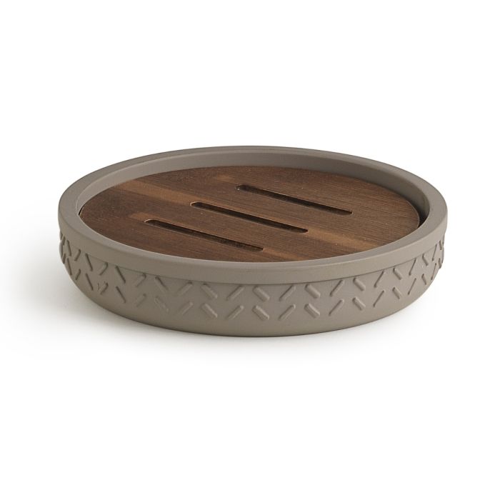 Portasapone linea THEA BAMBOOM in resina e legno di bambù colore naturale scuro e grigio, dimensioni Ø 12 × h 2,3 cm; dal design essenziale e materico combina la calda texture del bambù con la praticità della resina, offrendo una superficie stabile e facile da pulire ideale per il lavabo e aggiungendo un tocco naturale e raffinato al bagno.