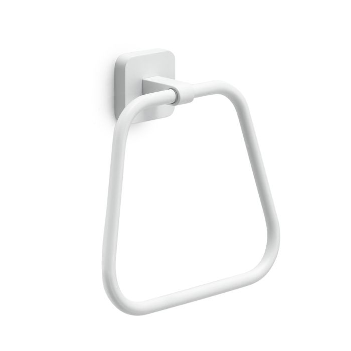 Portasalviette ad anello linea TONGA realizzato in acciaio inox e Cromall colore bianco Matt, dimensioni 17 × 4,6 × h 16 cm, fissaggio a muro con viti (incluse) o con biadesivo 3M già presente sul retro; dal design minimal e contemporaneo, offre robustezza e facilità di installazione, mantiene l’asciugamano sempre a portata di mano e aggiunge al bagno un tocco discreto ed elegante.