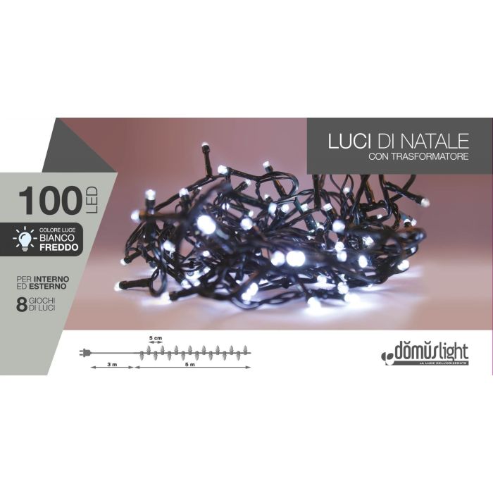 Luci di Natale con 100 LED a luce bianco freddo su una catena luminosa di 5 m e 3 m di cavo di alimentazione, passo tra i LED 5 cm e cavo di colore verde per un’integrazione discreta nelle decorazioni; alimentazione tramite adattatore 31V 3,6W incluso, dotate di 8 giochi di luce con chip di memoria che richiama l’ultima funzione selezionata e progettate per uso interno ed esterno, ideali per illuminare alberi, ghirlande, terrazze e balconi con un effetto brillante e uniforme.