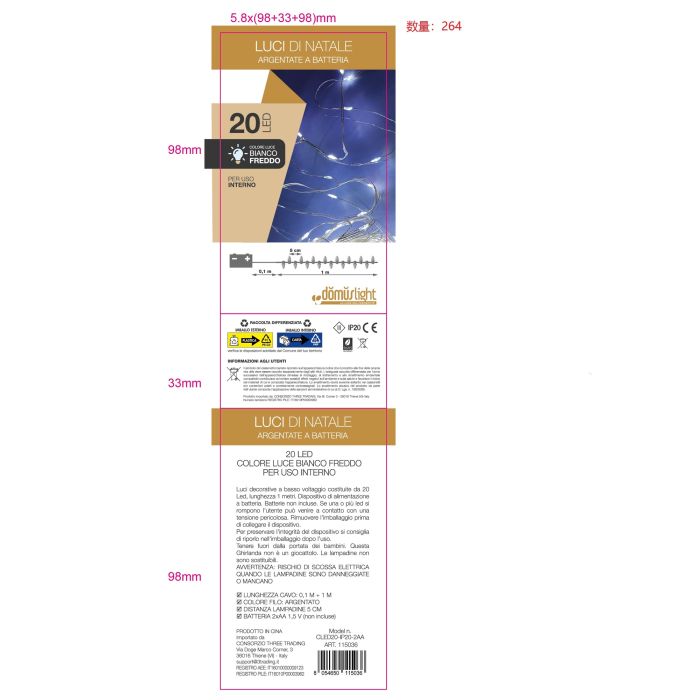 | Note | - Lunghezza catena luminosa: 1mt; - Lunghezza cavo di alimentazione: 0.1mt; - Filo argentato; - Distanza lampadine: 5cm; - Funziona a batteria (2xAA 1.5V non incluse); - Per uso interno |