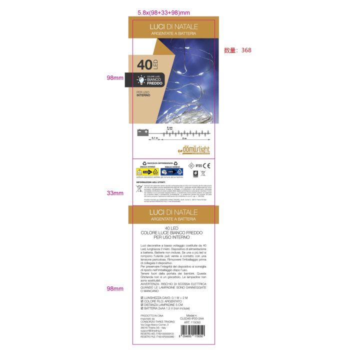 | Note | - Lunghezza catena luminosa: 2mt; - Lunghezza cavo di alimentazione: 0.1mt; - Filo argentato; - Distanza lampadine: 5cm; - Funziona a batteria (2xAA 1.5V non incluse); - Per uso interno |