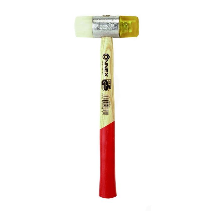 Mazzola in plastica/gomma Ø 35 mm, progettata per offrire colpi controllati senza danneggiare le superfici, con testa in gomma e plastica e manico in legno di frassino per una presa stabile; dotata di inserti cambiabili in nylon e acetato per diverse applicazioni e conforme alla certificazione CE.