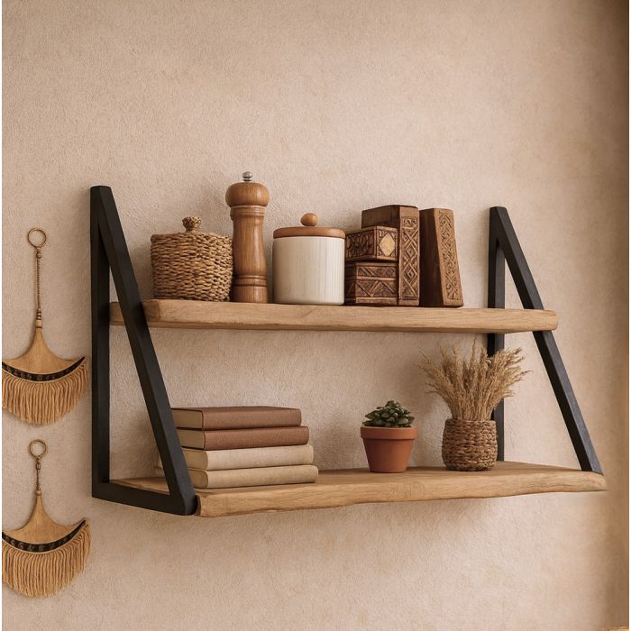 MENSOLA DA MURO 2 RIPIANI CM 100X33 H.45 IN METALLO E LEGNO DI ACACIA