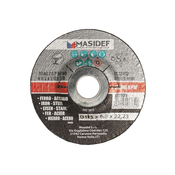 Mola da sbavo per acciaio e ferro, sagoma centro depresso progettata per lavorazioni su materiali ferrosi, leghe e fusioni, con Ø esterno 115 mm, Ø interno 22,23 mm, spessore 6,0 mm, prestazioni a 80 m/s e fino a 13.300 rpm, ideale per rimozione di materiale, sbavatura e finitura in officine e cantieri grazie alla lunga durata e all’efficienza di taglio.