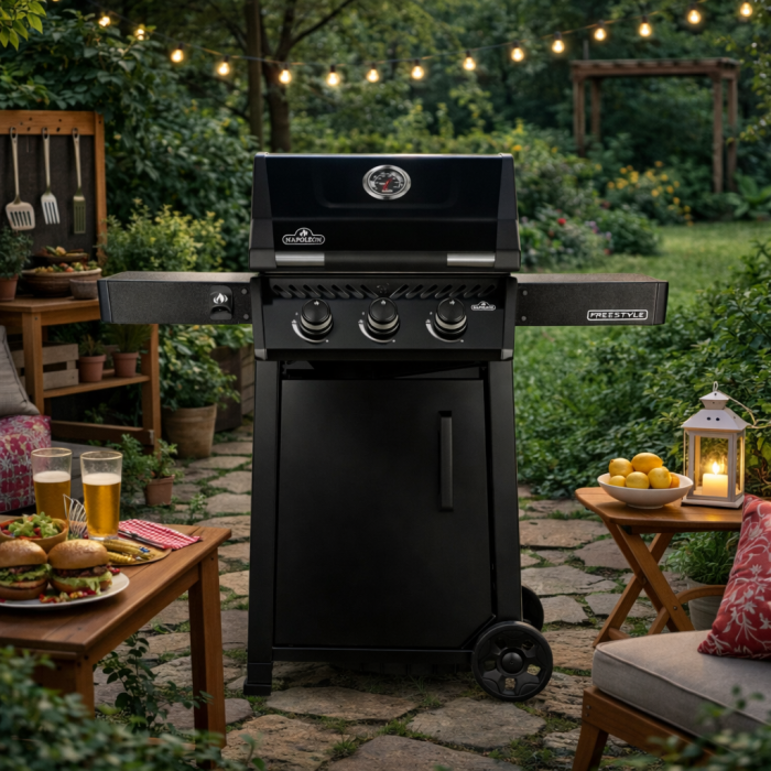 Il modello Napoleon® Freestyle™ 365 offre caratteristiche eccellenti e un valore imbattibile in un design compatto e salvaspazio. Ideale per patii, balconi e cortili di piccole dimensioni. Con un'area di cottura totale 3193,54 cm² (495 in²) e un'area di cottura principale 51,4 x 45,7 cm (20,25 x 18 in) si può cucinare per più persone e contemporaneamente si possono preparare più pietanze. Il sistema di accensione affidabile JETFIRE™ accende i bruciatori all'istante, mentre i bruciatori in acciaio inox e l'indicatore di temperatura ACCU-PROBE™ garantiscono un calore costante e un controllo preciso. Le griglie di cottura in ghisa porcellanata WAVE™ trattengono i succhi e garantiscono una cottura perfetta in ogni occasione. I ripiani laterali pieghevoli con ganci per utensili e apribottiglie integrati consentono di tenere gli oggetti essenziali a portata di mano senza occupare spazio extra. Resistente, facile da spostare grazie alle robuste ruote e con un'elegante finitura nero, Freestyle™ rende le grigliate quotidiane semplici, eleganti e piacevoli.