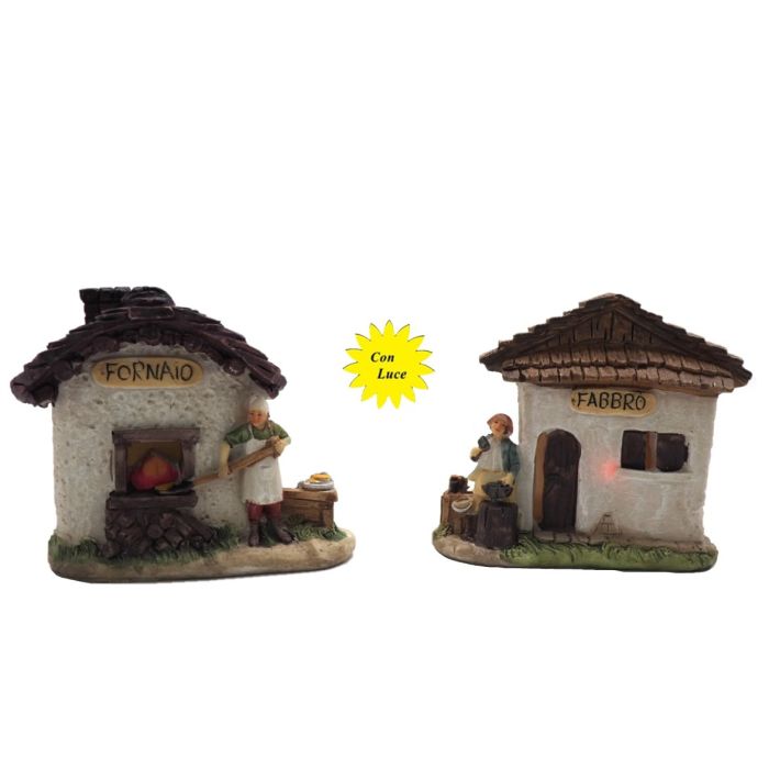 - Con personaggi ed attrezzi vari che riproducono i lavori del fornaio e del fabbro - Finemente decorati a mano - Con luce annessa per ricreare un'atmosfera calda e accogliente - Splendida decorazione per il paesaggio del presepe Prodotto Assortito |