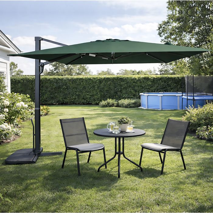 Ombrellone a braccio MYB: elegante e funzionale, con struttura in alluminio antracite, telo in poliestere 250 g/m² verde e ampia copertura 3x3 m; dotato di base a croce, apertura a manovella, camino di ventilazione e meccanismo girevole a 360° per massima versatilità; le mattonelle non sono comprese e il prodotto viene fornito parzialmente montato.