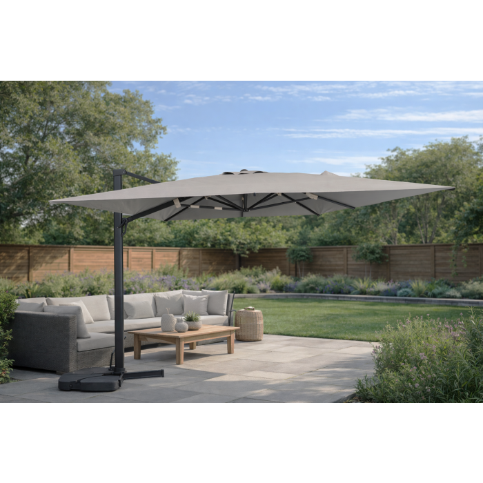 L’ombrellone a braccio MYB è una soluzione elegante e funzionale per creare un’ampia zona d’ombra grazie alla generosa copertura 3×4 m, sostenuta da una solida struttura in alluminio antracite e da un telo in poliestere 250 g/m² grigio chiaro resistente e di qualità; il design laterale con base a croce libera lo spazio sottostante e, insieme alla rotazione a 360°, al camino di ventilazione e all’apertura a manovella, garantisce praticità, comfort e una gestione ottimale del flusso d’aria; il prodotto è fornito parzialmente montato e mattonelle non incluse.