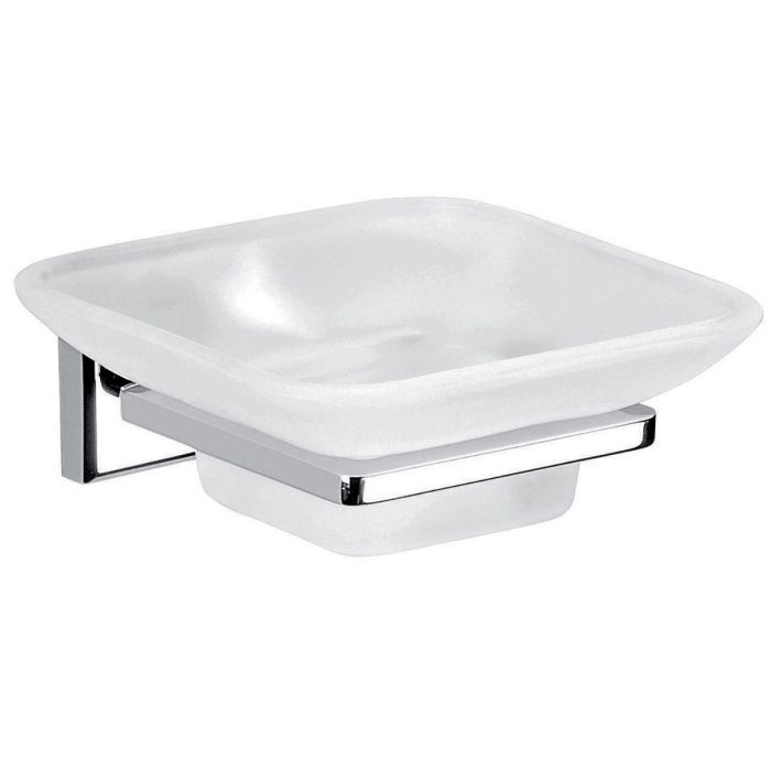Porta sapone linea COLORADO realizzato in acciaio inox AISI 304 e Cromall, colore cromato, con contenitore in vetro satinato, dimensioni 10×12,5 h. 5cm; fissaggio a muro con viti incluse o con colla (non inclusa) con carico testato fino a 7kg, pratico e resistente, ideale per mantenere ordine e igiene sul lavabo.