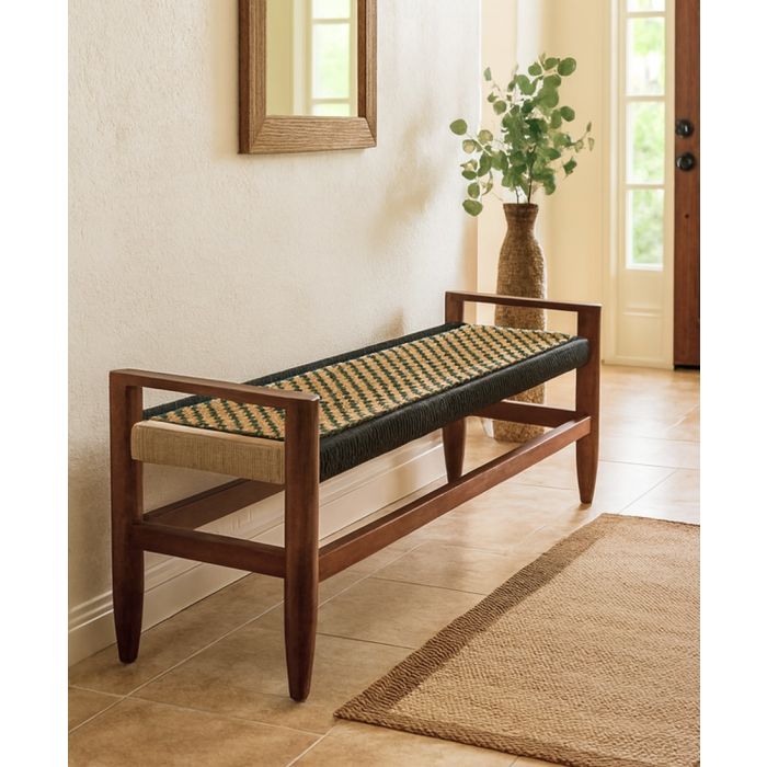 PANCA CM 118X40 H.45 IN LEGNO DI TEAK E CORDA BICOLORE BEIGE/ANTRACITE