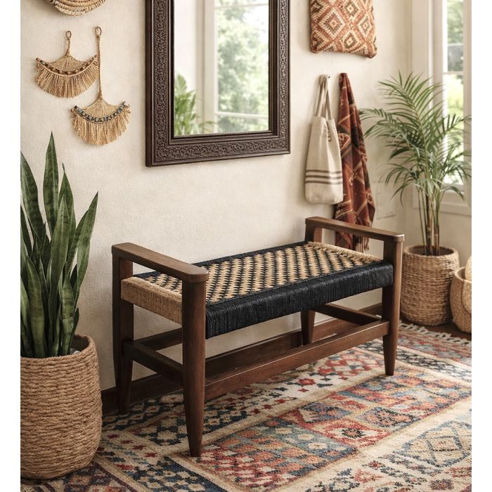 PANCA CM 60X40 H.45 IN LEGNO E CORDA BICOLORE BEIGE/ANTRACITE