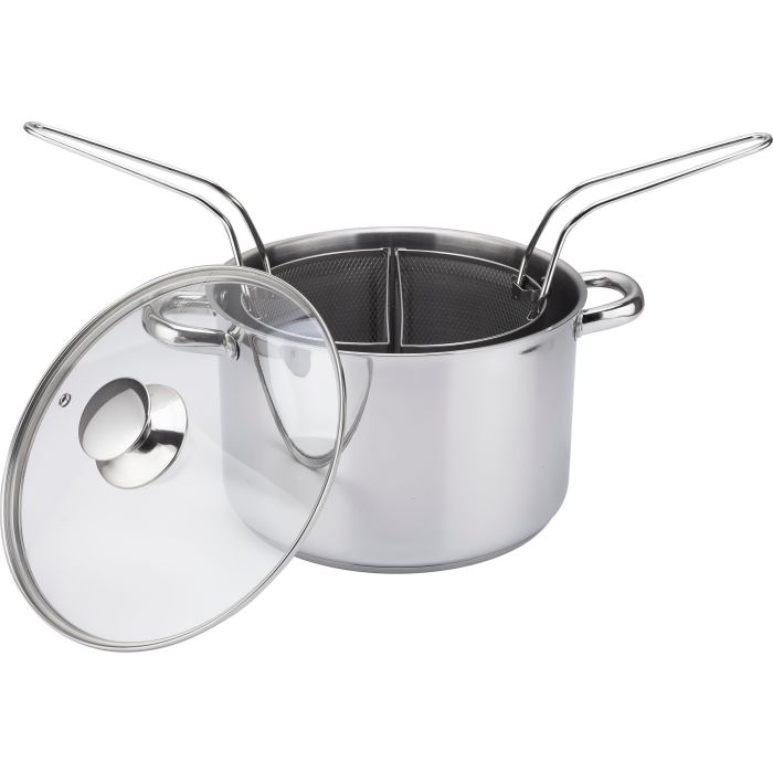 Bollipasta a doppio cestello in acciaio inox 18/0 AISI 430, diametro 20 cm e altezza 13,5 cm, con spessore 0,5 mm. Interno satinato, esterno lucido, fondo adatto all’induzione. Coperchio in vetro temperato con bordo e pomolo in acciaio inox, anch’esso con spessore 0,5 mm. Robusto e pratico, ideale per cuocere pasta o alimenti al vapore in modo efficiente.