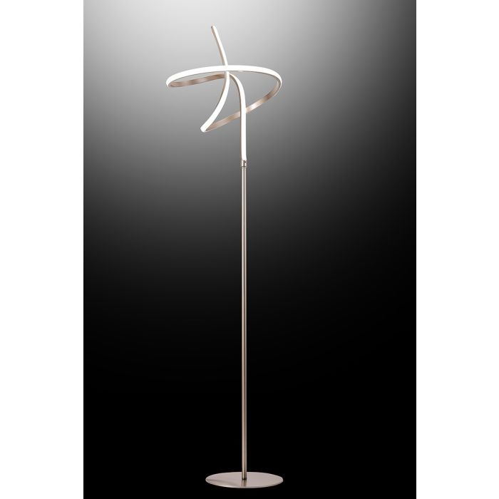 Piantana a LED RHONDA con struttura in alluminio nichel satinato e diffusore in silicone bianco, dimensioni Ø 35 × h.160 cm, dotata di illuminazione LED 28W (max 4500K, 1600 lumen) con durata 20.000 ore, classe di isolamento II, grado IP20, alimentazione 220–240V e resa equivalente a 100W, peso netto 2,7 kg e classe energetica E; elegante, compatta e pensata per un’illuminazione uniforme in ambienti living e professionali.