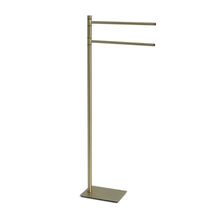Piantana porta salviette linea TRILLY in acciaio inox e Cromall colore oro spazzolato, dimensioni 34 × 14 × 83,5 cm (L × P × H); piantana a 2 braccia con stelo e braccia in acciaio inox AISI 201 e base in acciaio inox; design elegante e compatto, finiture resistenti e superficie facile da pulire; prodotto fornito smontato per un trasporto pratico e un montaggio semplice.