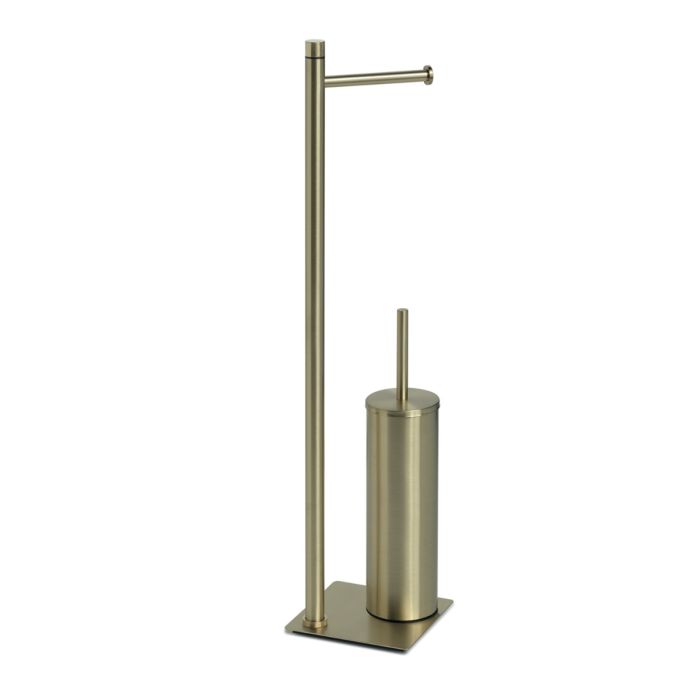 Piantana da bagno linea TRILLY in acciaio inox, Cromall, resina e sabbia, colore oro spazzolato, dimensioni 14×14 h. 63cm (L×P×H); composta da porta rotolo e porta scopino con stelo, braccia e base in acciaio inox, scopino integrato con ciuffo in setole nere e tazza interna estraibile per una pulizia semplice e igienica; design compatto e resistente, finiture curate e facile manutenzione; prodotto fornito smontato.