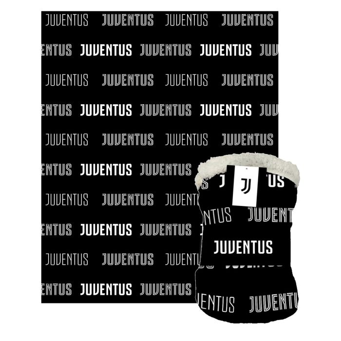 Plaid agnellato Juventus in 100% poliestere, misura 130×160 cm e grammatura 260 gsm, morbido e caldo, ideale per aggiungere comfort e un tocco sportivo agli ambienti; facile da mantenere, lavabile a 30°, non asciugabile in asciugatrice, stiratura non consentita e non lavabile a secco.