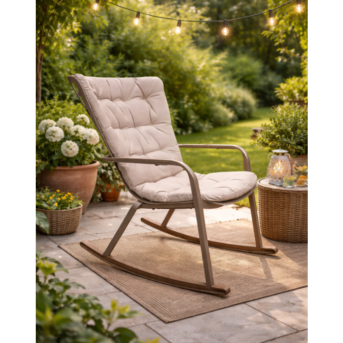 La poltrona Folio Rocking di Nardi è una seduta da esterno dal design contemporaneo e avvolgente, pensata per offrire comfort e stile in ambienti outdoor. Realizzata in resina fiberglass color tabacco, presenta una struttura monoblocco con linee fluide e una base curva che consente un delicato movimento a dondolo. Il cuscino abbinato, dallo spessore generoso di 7 cm, è progettato per garantire un comfort superiore. È dotato di pratiche fettucce in tessuto con chiusura in velcro, che ne facilitano il fissaggio alla seduta. Internamente, il tessuto è accoppiato con ovatta in fibra di poliestere, offrendo morbidezza e resistenza. Il cuscino è lavabile a 30° con programma delicati.