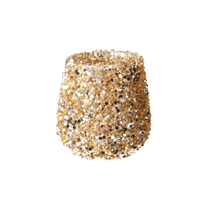PORTA CANDELA IN VETRO CON PERLINE/STRASS ORO H 8CM
