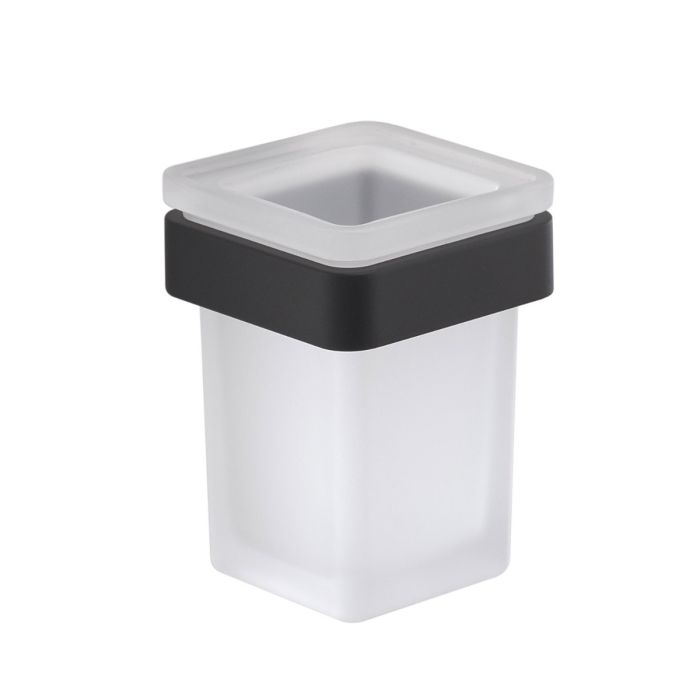 Bicchiere portaspazzolini linea SAMOA in ottone e Cromall, colore nero matt, dimensioni 7,5×8,8 h. 10,5cm (L×P×H); contenitore in vetro satinato e fissaggio a muro con viti, design compatto ed elegante con finiture opache resistenti, facile da pulire e perfetto per organizzare spazzolini con stile ottimizzando lo spazio del bagno.