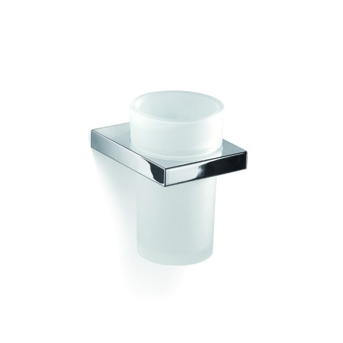 Bicchiere portaspazzolini linea LANZAROTE in ottone e Cromall, finitura cromata, dimensioni 7,8×9,5 h. 12cm (L×P×H); contenitore in vetro satinato e fissaggio a muro con viti; design elegante e compatto con finitura lucida resistente, facile da pulire e ideale per organizzare spazzolini con stile ottimizzando lo spazio del bagno.