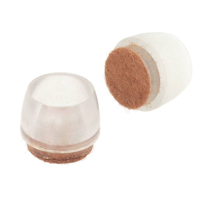 Puntali tondi dotati di estremità con feltrino integrato, protezione antigraffio da applicare alle estremità delle gambe di sedie, tavoli e tavolini. Realizzati in PVC, colore trasparente, con feltrino marrone.