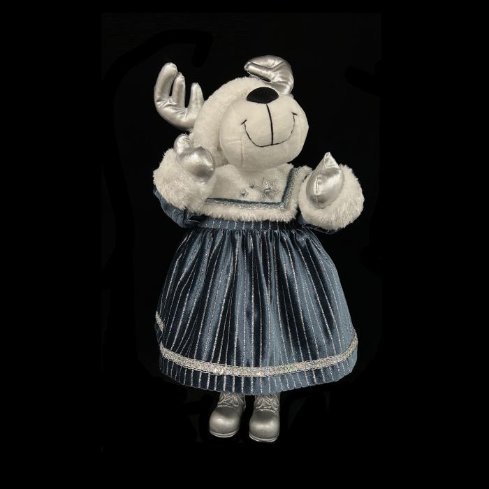 PUPAZZO RENNA FEMMINA CON VESTITO A RIGHETTE BLU H 55CM