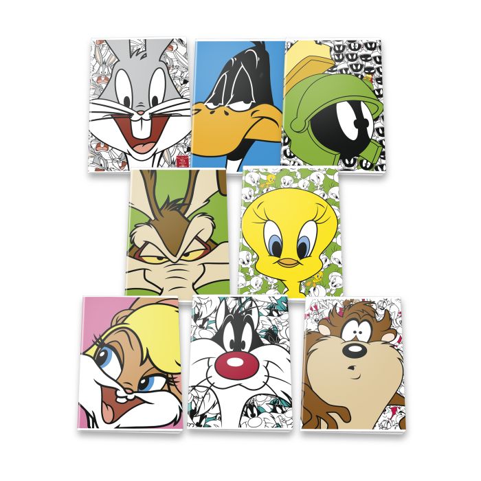 Quaderni a quadretti da 5mm adatti soprattutto per i più piccoli nell'ambiente scolastico, visto che le stampe assortite raffigurano i volti di molti personaggi del cartone animato "Looney Tunes". I bordi di questi quaderni sono stondati.