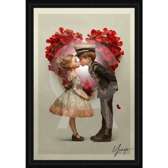 Quadro Collezione Yamata: stampa in alta definizione su PVC raffigurante due bambini che si baciano davanti a un grande cuore stilizzato, montata su telaio in legno con verniciatura selettiva in evidenza che valorizza colori e dettagli, corredata da certificato di autenticità e rifinita con cornice elegante; misure: immagine 50×70 cm, cornice 61.6×81.6 cm.