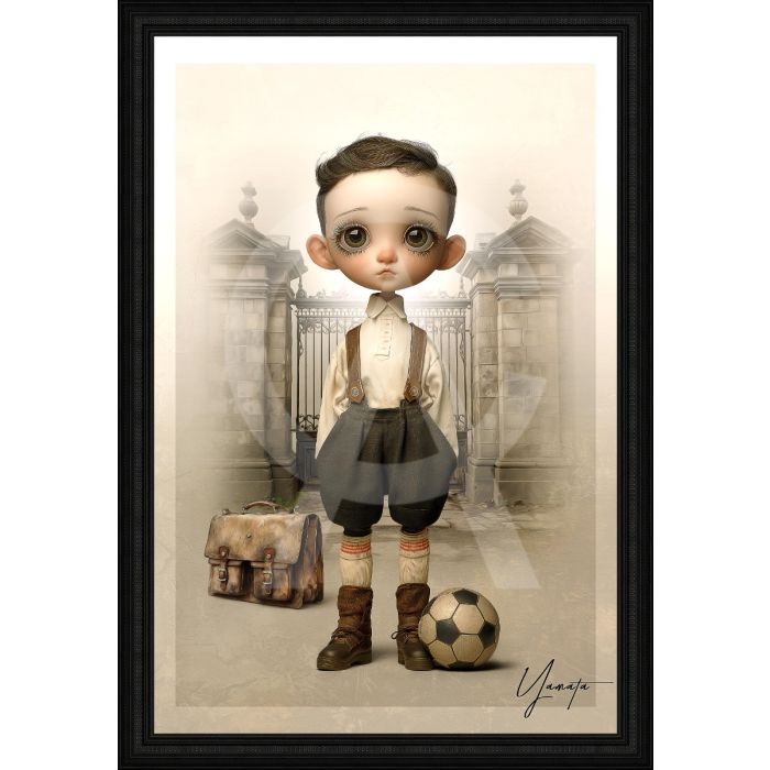 Quadro Collezione Yamata: stampa in alta definizione su PVC raffigurante un bambino con palla, montata su telaio in legno con verniciatura selettiva in evidenza che valorizza colori e dettagli, corredata da certificato di autenticità e rifinita con cornice elegante; misure: immagine 80×120 cm, cornice 91.6×131.6 cm.