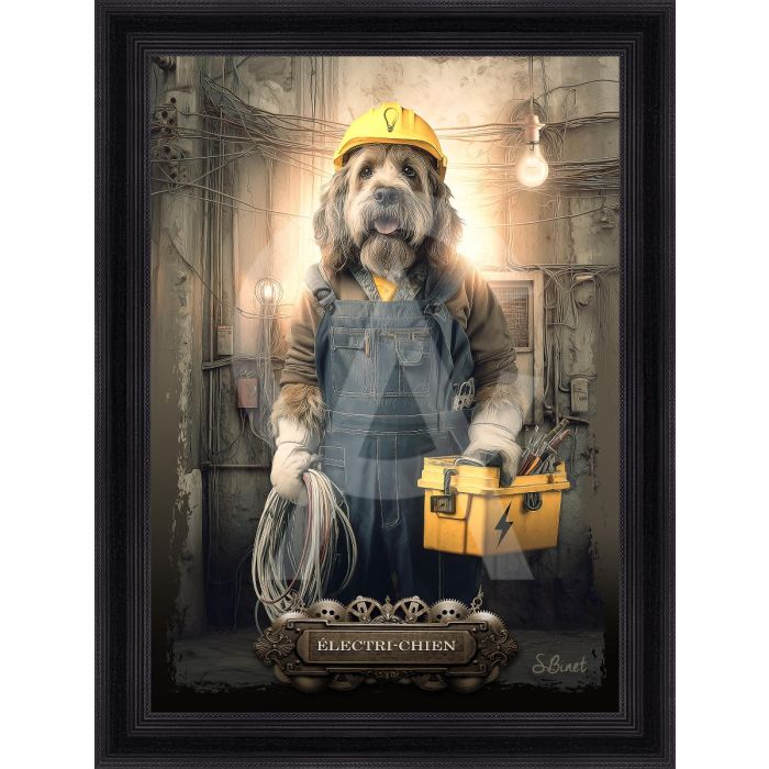 Quadro Collezione Sylvain Binet: stampa in alta definizione su PVC raffigurante un cane in veste di elettricista, montato su telaio in legno con verniciatura selettiva in evidenza che esalta dettagli e texture, corredato da certificato di autenticità; misure: immagine 50×70 cm, cornice 62×82 cm.