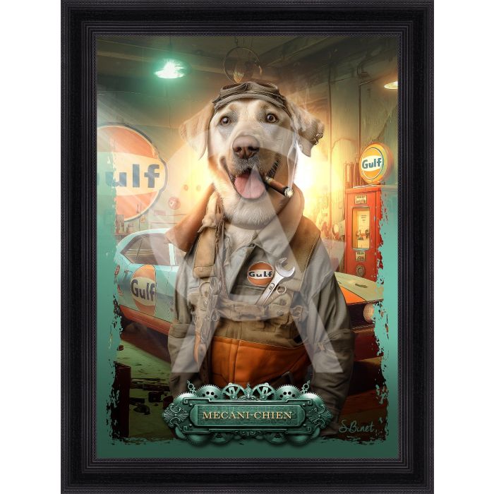 Quadro Collezione Sylvain Binet: stampa in alta definizione su PVC raffigurante un cane in veste di meccanico, montato su telaio in legno con verniciatura selettiva in evidenza che valorizza dettagli e texture, corredato da certificato di autenticità e rifinito con cornice nera; misure: immagine 50×70 cm, cornice 62×82 cm.