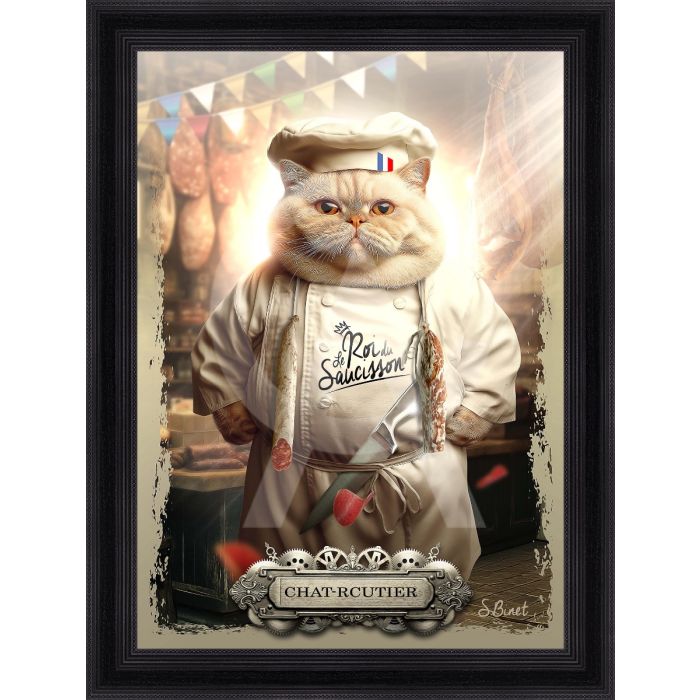 Quadro Collezione Sylvain Binet: stampa in alta definizione su PVC raffigurante un gatto bianco, grande e peloso, ritratto in veste di salumiere, montato su telaio in legno con verniciatura selettiva in evidenza che valorizza texture e dettagli, corredato da certificato di autenticità e rifinito con cornice nera; misure: immagine 50×70 cm, cornice 62×82 cm.