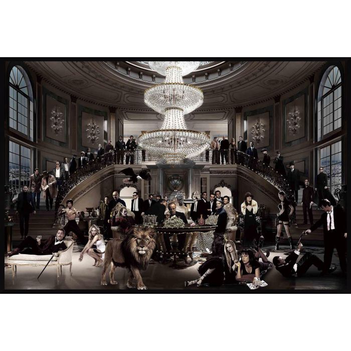 Quadro con stampa su vetro che presenta un fotomontaggio artistico raffigurante una folla di celebrità internazionali riunite in un sontuoso salone d’ingresso con doppia scala, un imponente lampadario e un leone posizionato quasi al centro, realizzato su pannello in vetro da 4 mm che conferisce brillantezza e profondità all’immagine; dimensioni 60×90 cm, ideale per aggiungere un tocco scenografico e contemporaneo agli ambienti.