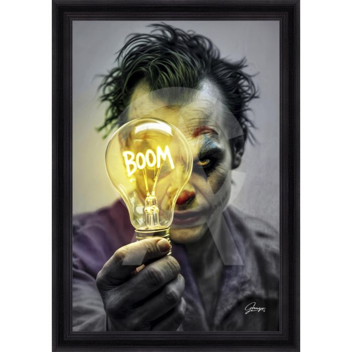 Quadro Collezione Granger: stampa in alta definizione su PVC raffigurante il Joker che tiene in mano una lampadina con la scritta "BOOM", montato su telaio in legno con verniciatura selettiva in evidenza per esaltare i dettagli, protetto da cornice nera e corredato da certificato di autenticità; misure: immagine 60×90 cm, cornice 72×102 cm.
