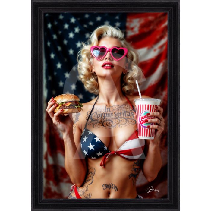 Quadro Collezione Granger: stampa in alta definizione su PVC raffigurante una ragazza bionda tatuata in bikini americano (blu con stelle bianche e rosso), con occhiali da sole a forma di cuore, che tiene in una mano un hamburger e nell’altra una bibita, su sfondo bandiera americana; montato su telaio in legno con verniciatura selettiva in evidenza per esaltare dettagli e texture, corredato da certificato di autenticità; misure: immagine 60×90 cm, cornice 72×102 cm.