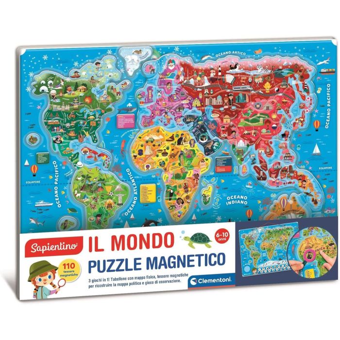 Un colorato puzzle magnetico per scoprire il mondo. Contiene anche un gioco di colpo d'occhio scoprire le particolarità; di ogni zona.