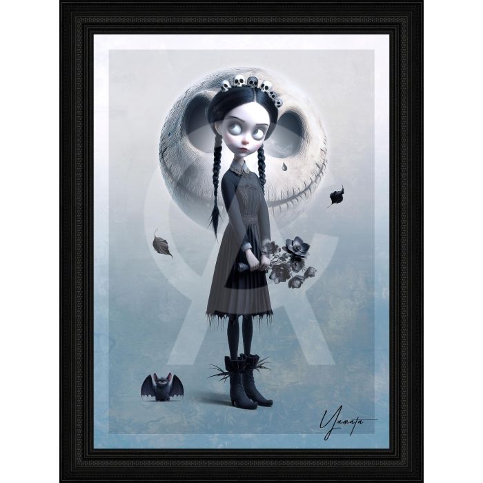 Quadro Collezione Yamata: stampa in alta definizione su PVC raffigurante Mercoledì Addams, montata su telaio in legno con verniciatura selettiva in evidenza che esalta contrasti e dettagli, corredata da certificato di autenticità e rifinita con cornice elegante; misure: immagine 50×70 cm, cornice 61.6×81.6 cm.