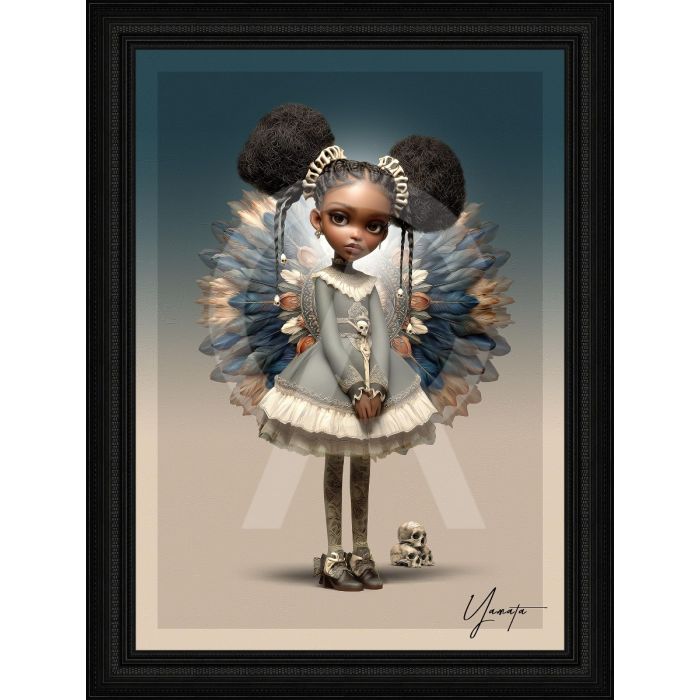 Quadro Collezione Yamata: stampa in alta definizione su PVC raffigurante una ragazza con ali, montata su telaio in legno con verniciatura selettiva in evidenza che valorizza contrasti e dettagli, corredata da certificato di autenticità e rifinita con cornice elegante; misure: immagine 50×70 cm, cornice 61.6×81.6 cm.