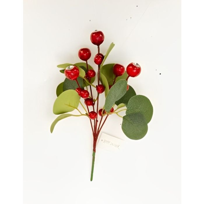 RAMETTO FOGLIE VERDI CON BACCHE ROSSE E GEMMA H. 30CM