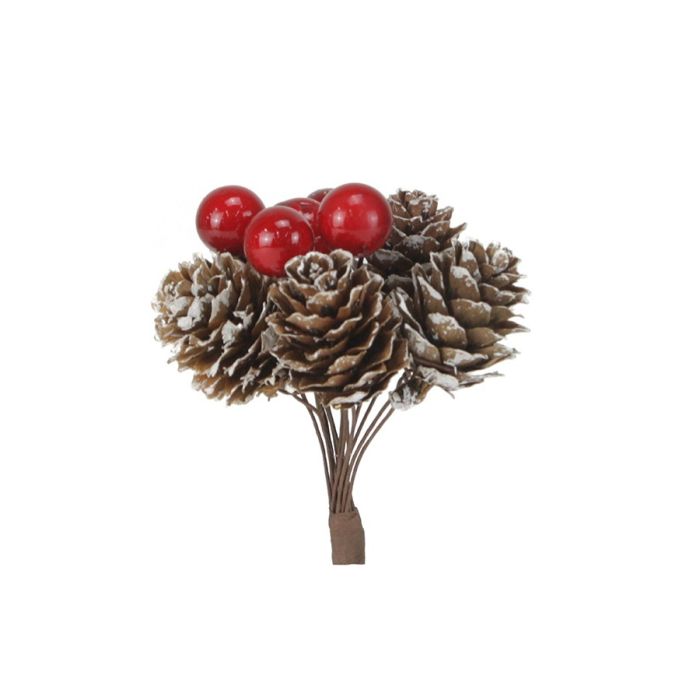 RAMO CON PIGNE NATURALI E BACCHE ROSSE H 16CM INNEVATO