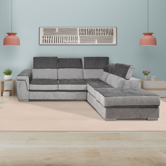 Questo ampio divano angolare con penisola reversibile è pensato per offrire massima versatilità e comfort in ogni ambiente living. Realizzato in tessuto bicolore grigio non sfoderabile, si distingue per il suo design moderno e funzionale. La penisola reversibile consente di adattare facilmente la configurazione dello spazio, mentre il pratico carrello estraibile permette di ampliare la superficie di seduta o trasformarla in un comodo letto d’emergenza. Incluso nella composizione, un pouff da 67x108 cm. I poggiatesta reclinabili garantiscono un supporto ergonomico e personalizzabile. Le dimensioni complessive del divano sono di 285x245 cm, con una profondità di 108 cm e un’altezza variabile da 82 a 101 cm in base alla posizione dei poggiatesta. Un elemento d’arredo completo, pensato per chi cerca stile, funzionalità e comfort in un’unica soluzione.