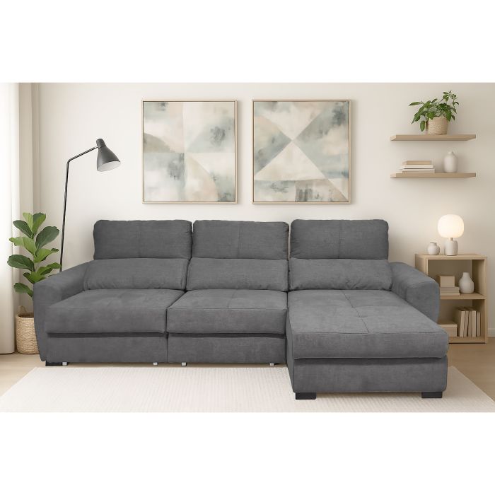 Un elegante salotto moderno è dominato da un divano angolare con penisola contenitore destra reversibile, pensato per unire funzionalità e stile, con una struttura imponente che misura 285x177 cm e un’altezza totale di 108 cm; rivestito in tessuto grigio scuro non sfoderabile, trasmette un senso di sobria raffinatezza perfetto per ambienti contemporanei e sofisticati; i poggiatesta reclinabili permettono di adattare la seduta alle diverse esigenze di relax, mentre le 2 sedute slide manuali offrono la possibilità di estendere la profondità per un comfort personalizzato; la seduta alta 43 cm garantisce una postura naturale e accogliente, mentre la profondità di 108 cm assicura ampio spazio per distendersi; la penisola integra un capiente vano contenitore ideale per riporre plaid, cuscini o accessori mantenendo l’ambiente ordinato e armonioso; il divano diventa così il fulcro del salotto, un mix di praticità e design che invita al relax quotidiano e si presta a momenti conviviali, con la tonalità grigio scuro che si abbina facilmente a palette neutre o pastello valorizzando sia ambienti minimal che spazi decorati con dettagli più caldi e festivi.