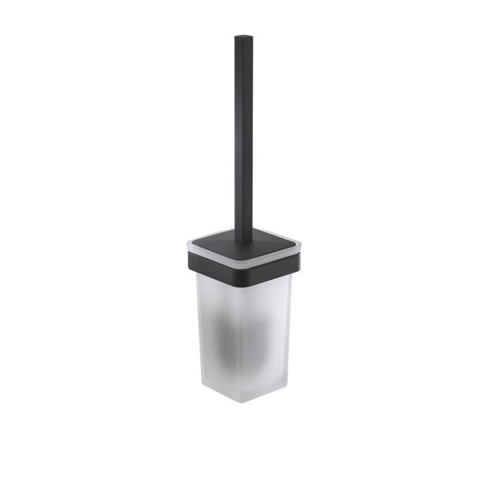 Portascopino linea SAMOA in ottone e Cromall, colore nero matt, dimensioni 10×11,3 h. 41,7cm (L×P×H); contenitore in vetro satinato (portascopino) con scopino integrato e ciuffo in setole nere, tazza interna estraibile per una pulizia agevole; design solido e raffinato con finiture opache resistenti, pratico e perfetto per completare il bagno con stile.