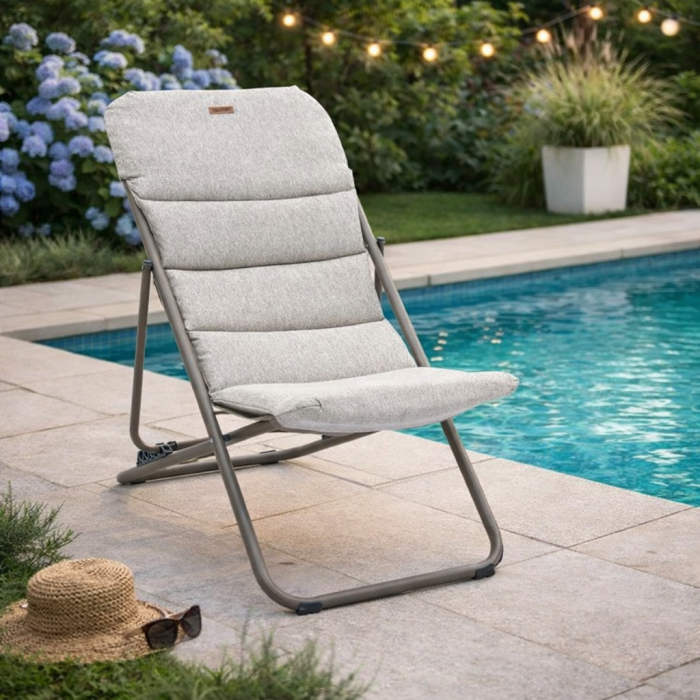 Sdraio pieghevole da esterno NILLIA con struttura in alluminio colore caffè e rivestimento in tessuto idrorepellente melange beige, dimensioni 92 × 59 × h.93 cm, reclinabile in 4 posizioni e pieghevole per un facile stoccaggio; leggero, resistente e pensato per il relax all’aperto, il prodotto viene fornito montato.