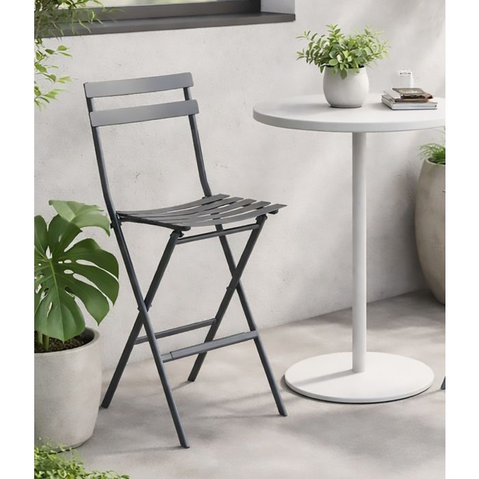 Lo sgabello da esterno mod. GREENSBORO è realizzato in acciaio verniciato colore grafite, resistente e ideale per l’uso outdoor; misura 42x49 cm con altezza totale di 102 cm e seduta a 63 cm, è pieghevole per una facile gestione degli spazi e viene fornito già montato, pronto all’uso.
