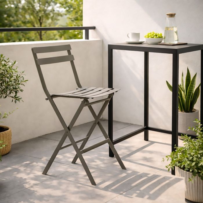 Lo sgabello da esterno mod. GREENSBORO è realizzato in acciaio verniciato colore tortora, resistente e ideale per l’uso outdoor; misura 42x49 cm con altezza totale di 102 cm e seduta a 63 cm, è pieghevole per una facile gestione degli spazi e viene fornito già montato, pronto all’uso.